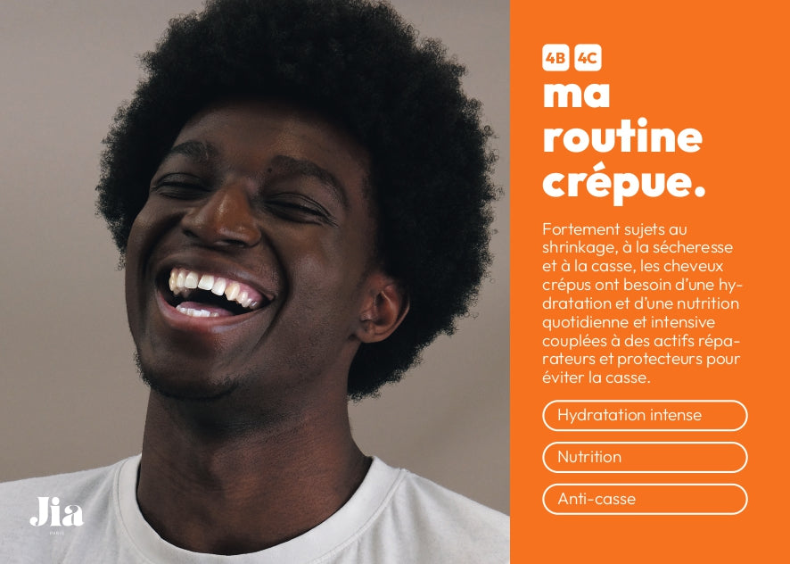 Découvrez notre routine For My Curls de Jia Paris spécialement adaptée à vos cheveux crépus. Du lavage au coiffage en passant par les soins, nous vous avons sélectionné la meilleure combinaison de produits. Ce type de cheveux a des boucles si serrées qu’il n’en forme pas réellement à l'œil nu, la fibre capillaire est plutôt en forme de Z. Il est fortement sujet au shrinkage, à la casse, au manque de souplesse et au maintien difficile de l’hydratation au cœur de la fibre. Il a besoin d’une hydratation quotidienne et d’une nutrition intense pour la sceller, couplée à des actifs réparateurs et protecteurs afin de maintenir des longueurs fortes, assouplies et un magnifique volume.
